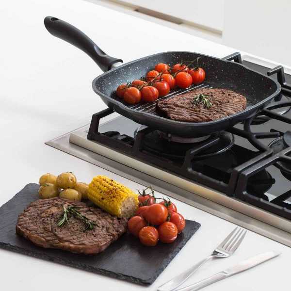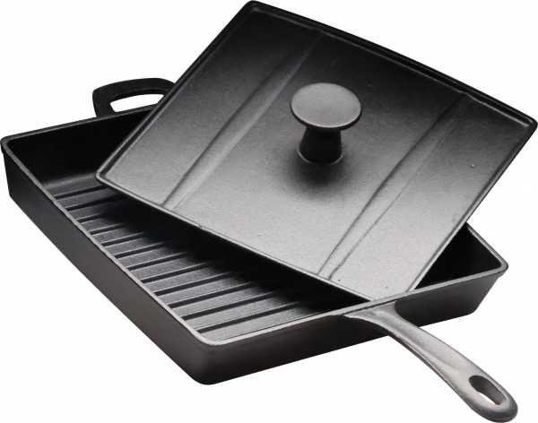 Характерная особенность таких сковородок — ребристое днище. Это позволяет придать продукту красиво подрумяненные ребристые следы, при этом использую минимальное количество масла для жарки. Сковородки-гриль бывают не только круглой, но и прямоугольной формы. Они часто укомплектованы тяжелой стеклянной крышкой и специальной дополнительной решеткой, которая крепится на стенки.