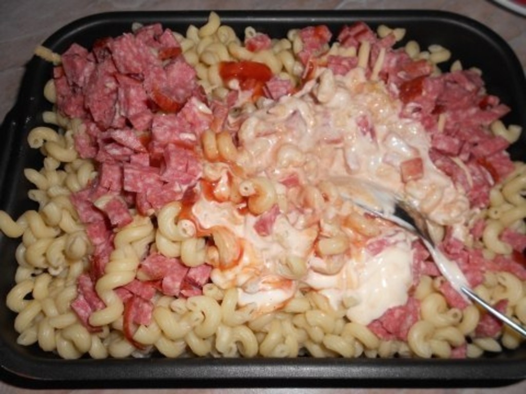 Порежьте колбасу кубиками или полосками среднего размера, старайтесь подогнать соразмерно макаронам. Выложите поверх основы.