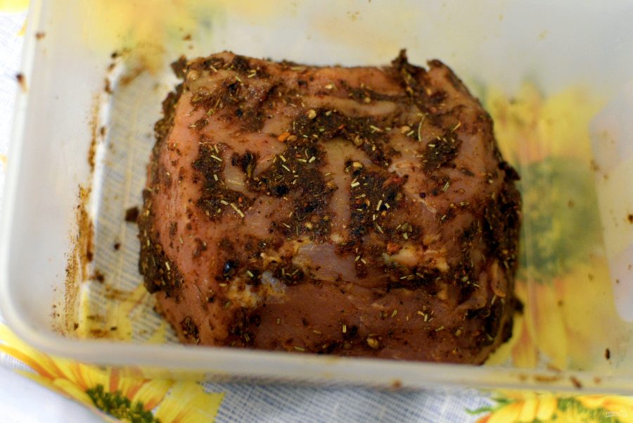 Подготовленный кусок положите в глубокую миску, закройте пищевой пленкой и оставьте на время. Двух-трех часов при комнатной температуре вполне достаточно для того, чтобы основной ингредиент пропитался приправами. Но рецепты допускают, что миска может спокойно переночевать в холодильнике.
