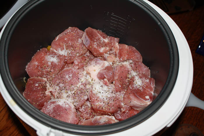 - Добавьте свинину и все, кроме кукурузного крахмала и 1/4 стакана воды в мультиварку.