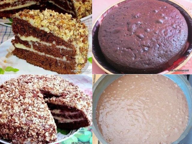 В смазанную маслом форму, вылить полученное тесто, форму поместить в разогретую духовку. Выпекать 2 коржа — 50 минут при температуре 200-170 градусов. Готовым коржам дать остыть, коржи разрезать острым ножом.