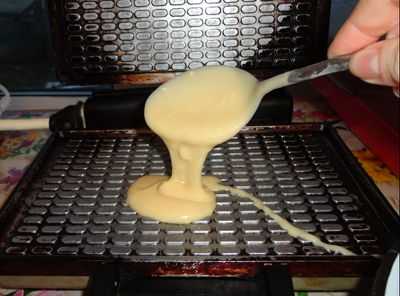 После этого аккуратно тоненькой струйкой всыпать муку, все время, перемешивая при этом тесто, чтобы избежать образования мелких комочков из муки, выпекать на раскалённой вафельнице обычным способом.