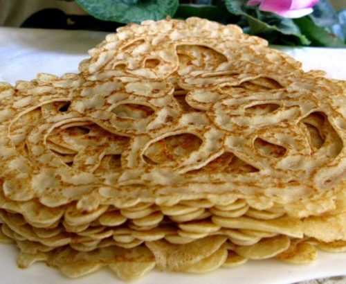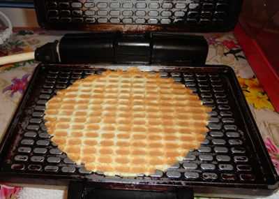 Раскалить вафельницу, смазать ее маслом. В столовую ложку набрать теста и распределить его по поверхности вафельницы хаотично: по кругу и поперек, расстояние между ними надо делать широкое, ведь тесто будет прижатым. По внешнему виду такая вафля будет напоминать вязаную ажурную салфетку. Прижать тесто крышкой вафельницы на 1-1,5 минуты. Снять и быстро скрутить ее в форме кулечка, как для пиццы, тогда ажурность будет просматриваться.