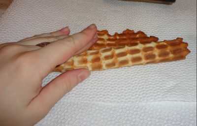 Если мы планируем делать трубочки из вафли, то наша задача быстро скрутить готовую горячую вафлю. Буквально через несколько секунд вафелька затвердеет, и сделать это уже не получится.