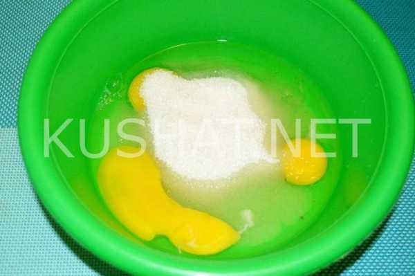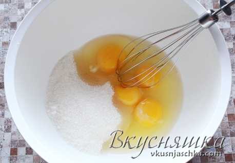 Взбиваем яйца с сахаром, смешанным с ванильным сахаром. С миксером процесс пройдет быстрее. (Не забудьте добавить щепотку соли).