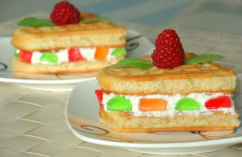 Совет. Можно испечь вафли отдельно и сделать начинку из мармелада и тврога.
