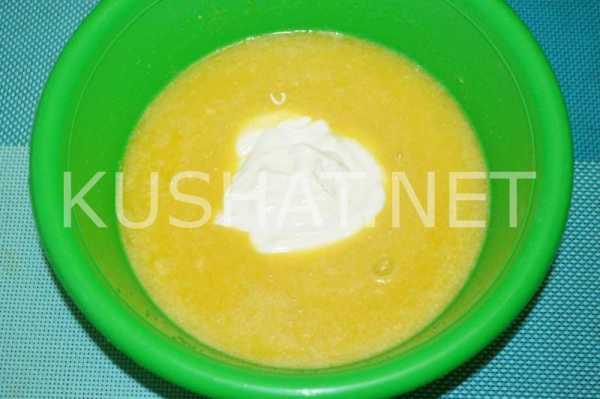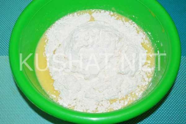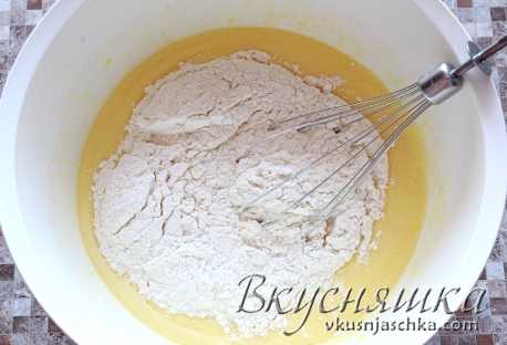 Теперь можно высыпать муку, потребуется примерно 1,5 стакана, если тесто получится жидковатое, добавьте еще немножко муки. После хорошенько перемешайте, чтобы не было комочков.