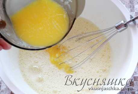 Чуть остудив, вливаем его в смесь яиц и сахара. Продолжаем взбивать.