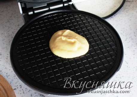 Разогрев заранее электровафельницу, накладывать 1 столовую ложку теста и разравнять по поверхности вафельницы.