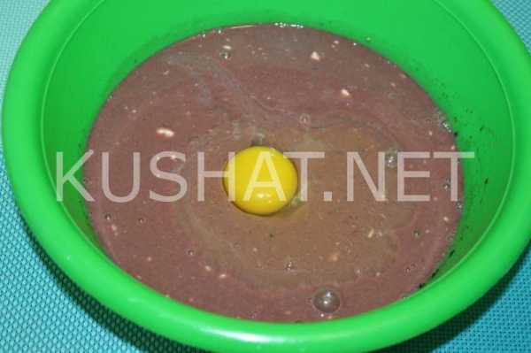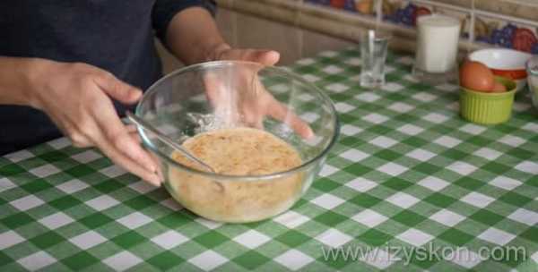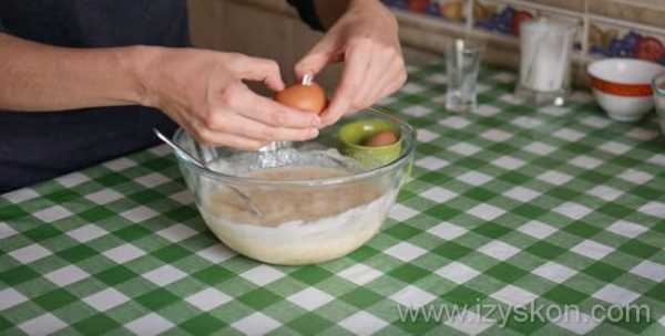 - Вбейте яйца и, постепенно добавляя муку, замешайте немного жидковатое тесто, как обычно делают на оладьи.