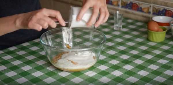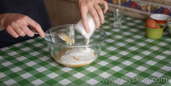 - Всыпать муку, смешанную с пищевой содой. Замесить.