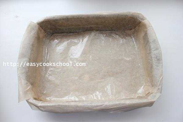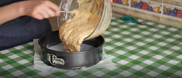 - Форму для выпекания застелите пергаментной бумагой и смажьте маслом. Равномерно распределяя, выложите тесто и отправьте пирог на 60 минут в духовку с температурой 180°.