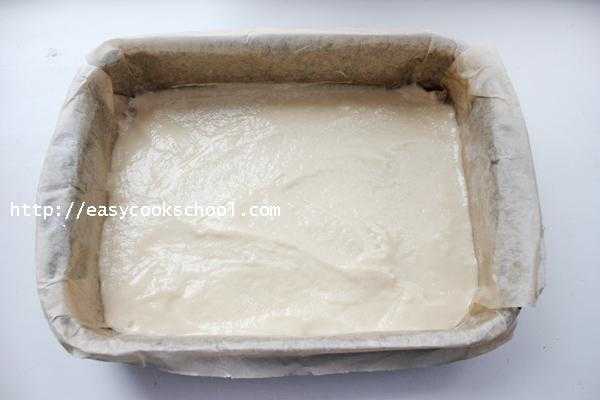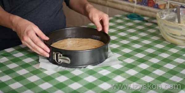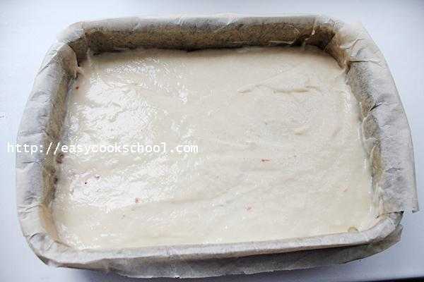 - Форму для выпечки смажь маслом, посыпь панировочными сухарями или мукой (толченые овсяные хлопья также подойдут). Вылей тесто в форму.
