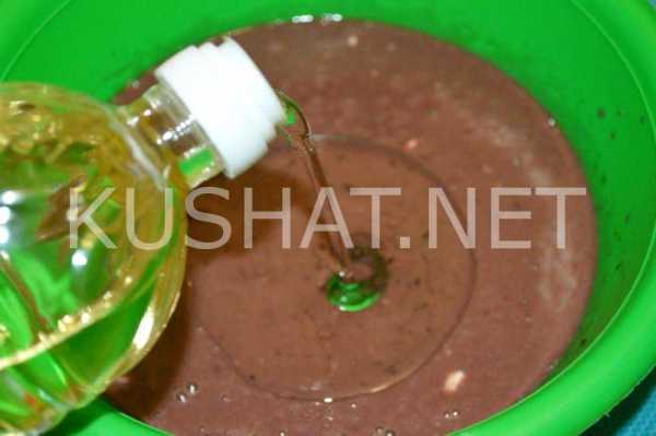 После добавления сахара венчиком перемешайте тесто для пирога еще раз. Влейте подсолнечное масло.