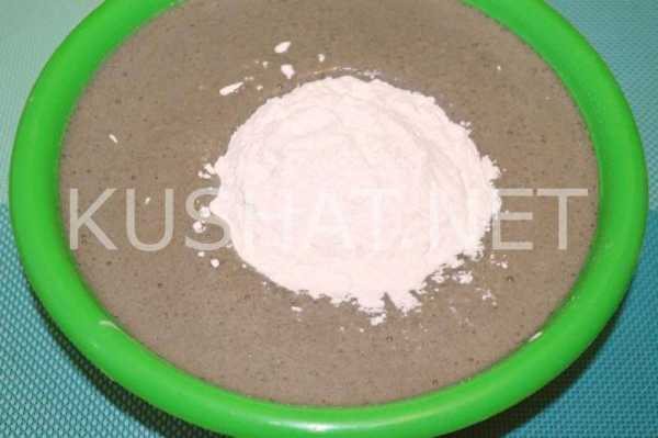 После очередного перемешивания остается добавить в тесто просеянную пшеничную муку.