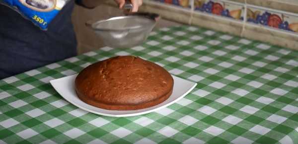 - Готовый корж разрезать чистой ниткой или очень острым ножом вдоль на 3 части.