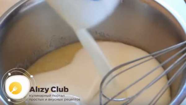 - Добавьте муку, все время мешая, чтобы не было комочков. Яичный белок взбейте с помощью миксера в пышную пену и добавьте его в тесто. Оно должно быть немного жидким, но не сильно растекаться.
